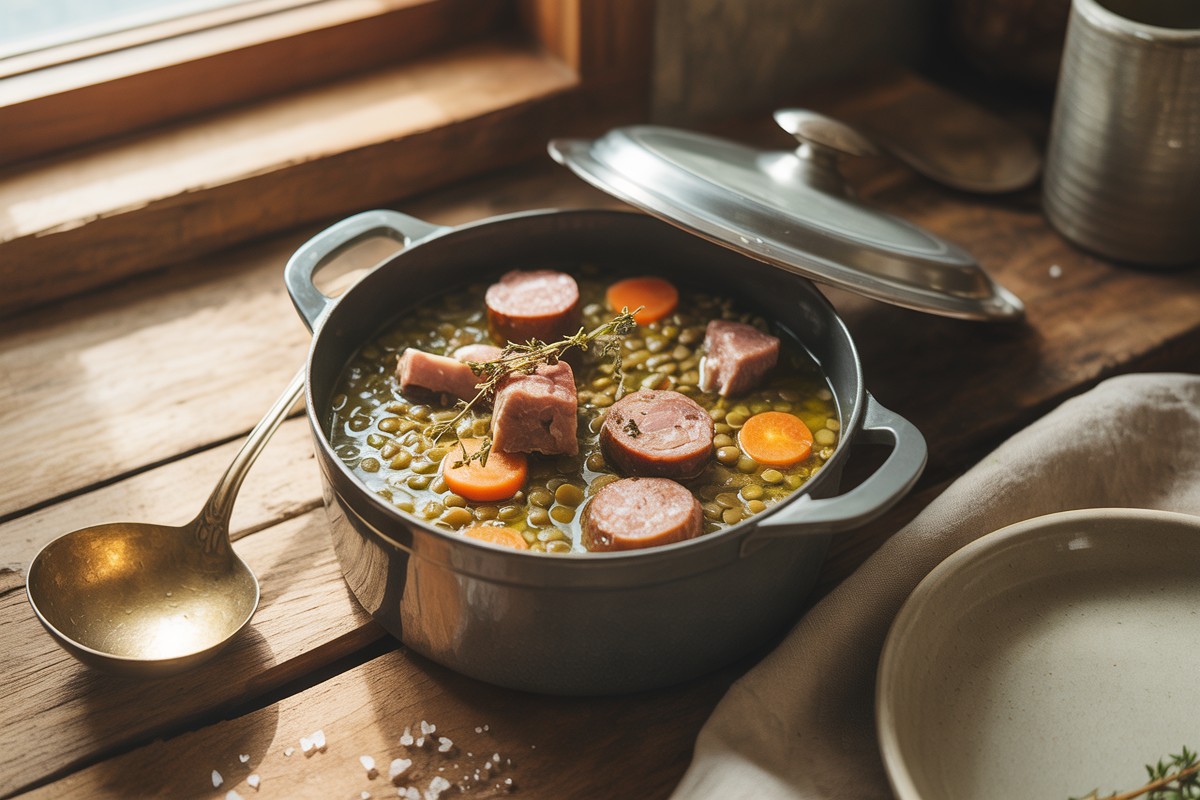Plongez directement dans l’ambiance chaleureuse d’une cuisine de terroir avec une bonne cocotte en fonte qui frémit doucement sur le feu. Cette recette de petit salé aux lentilles est le plat rustique et réconfortant par excellence pour les grandes tablées. Comptez environ 3 heures au total pour une réalisation facile, qui demande juste un peu de patience. Voici tout ce qu’il vous faut pour réussir ce grand classique.